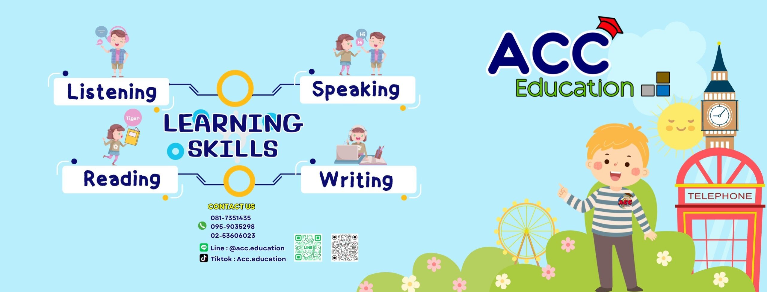 ACC Education คือผู้ให้บริการให้คำปรึกษาด้านการศึกษาและบริการด้านภาษาชั้นนำในประเทศไทย ก่อตั้งขึ้นในปี พ.ศ. 2540 ด้วยวิสัยทัศน์ที่จะยกระดับโอกาสการสื่อสารและการเรียนรู้ระดับโลกสำหรับนักเรียนไทย เราเชี่ยวชาญในการจัดการศึกษาภาษาต่างประเทศคุณภาพสูง โดยเฉพาะอย่างยิ่งภาษาอังกฤษ ภาษาญี่ปุ่น และภาษาจีน ผ่านโปรแกรมที่ออกแบบเฉพาะสำหรับผู้เรียนทุกเพศทุกวัย